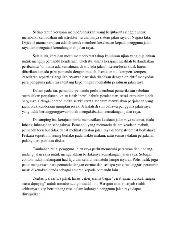 . Peraturan-peraturan jalan raya seharusnyan dikaji semula dan ditambah baik bagi memastikan keselamatan pengguna sentiasa terpelihara. Add to my workbooks 0 Embed in my website or blog Add to Google Classroom. Ulasan - cara-cara mengurangkan kadar kemalangan di jalan raya ULASAN DALAM 3 PERENGGAN ID.
